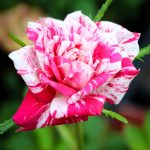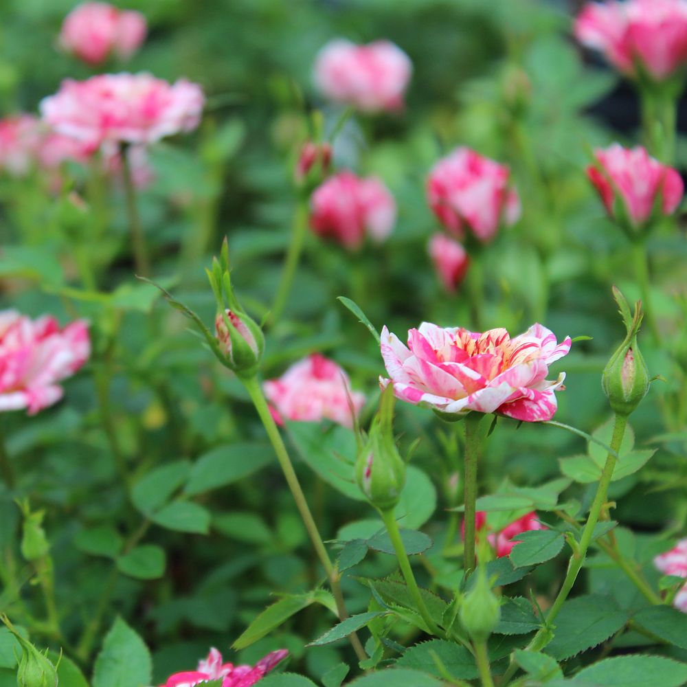 A unique miniature rose, Charlie Brown sports a red and white striped rose with a mild fragrance. Blooms come in flushes throughout the season on a tidy and disease resistant miniature shrub.  Great for containers.
