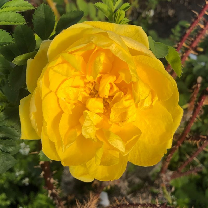 Like Harison’s Yellow, this rose was also brought west with early settlers. Medium yellow semi-double, open blooms in late spring. Shrub is upright, fairly dense, and tends to sucker. Height to 6 feet.