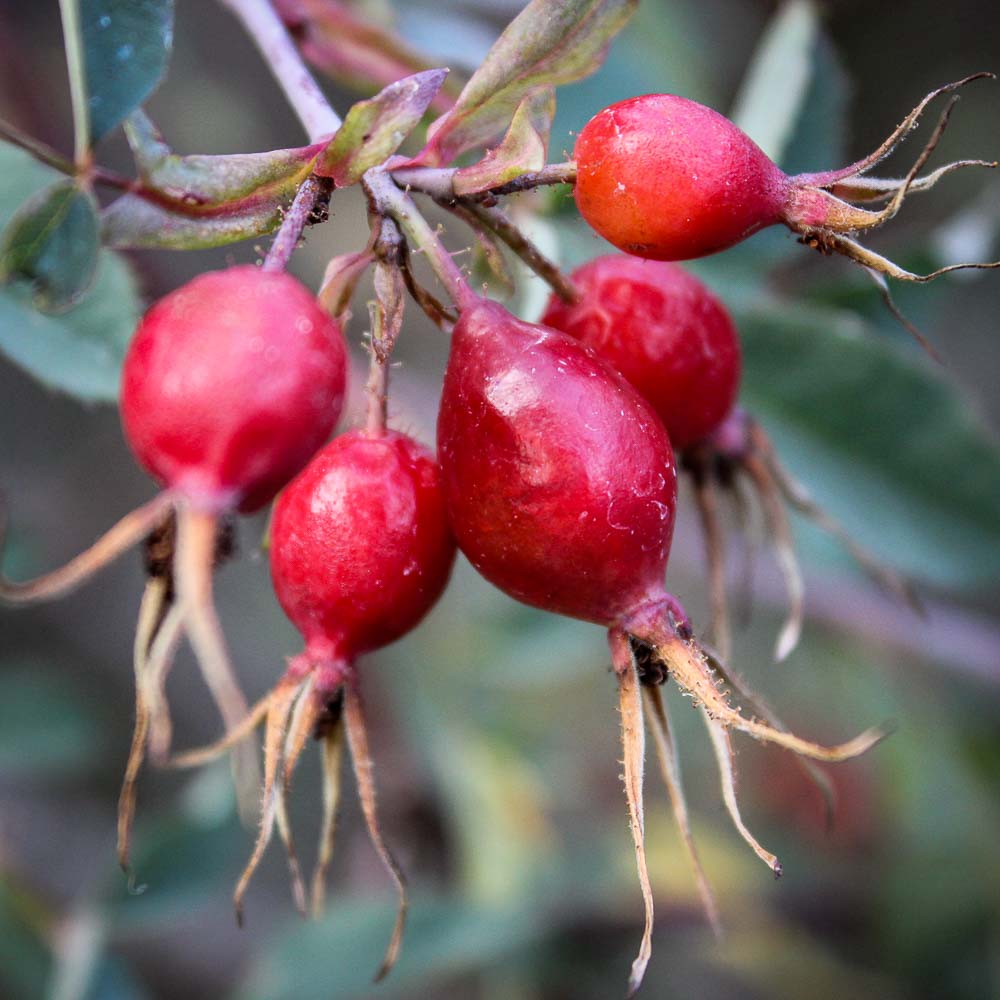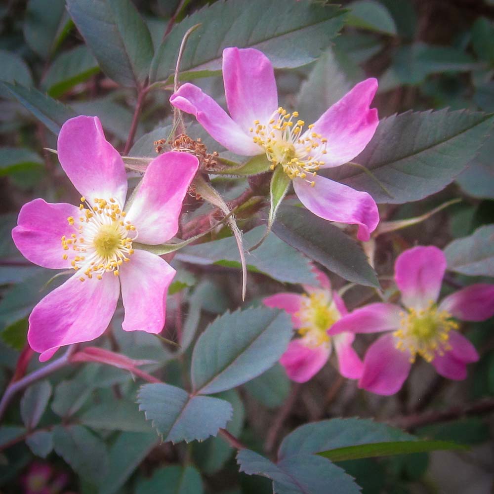 Starry, single pink flowers in spring are complemented by plum colored foliage. Orange hips remain on the bush through fall and winter. A very hardy, drought resistant shrub with graceful red canes 7 to 9 feet tall.